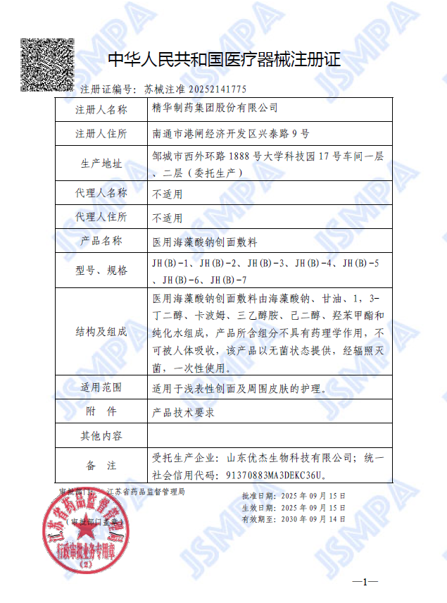 2025年9月16日,精华制药集团股份有限公司收到江苏省药品监督管理局核发的医用海藻酸钠创面敷料《中华人民共和国医疗器械注册证》(注册证编号:苏械注准 20252141775)。该产品开发初衷为辅助公司核心产品季德胜蛇药片外用,以期为片剂外用提供更便利的使用方式与更好的体验。…