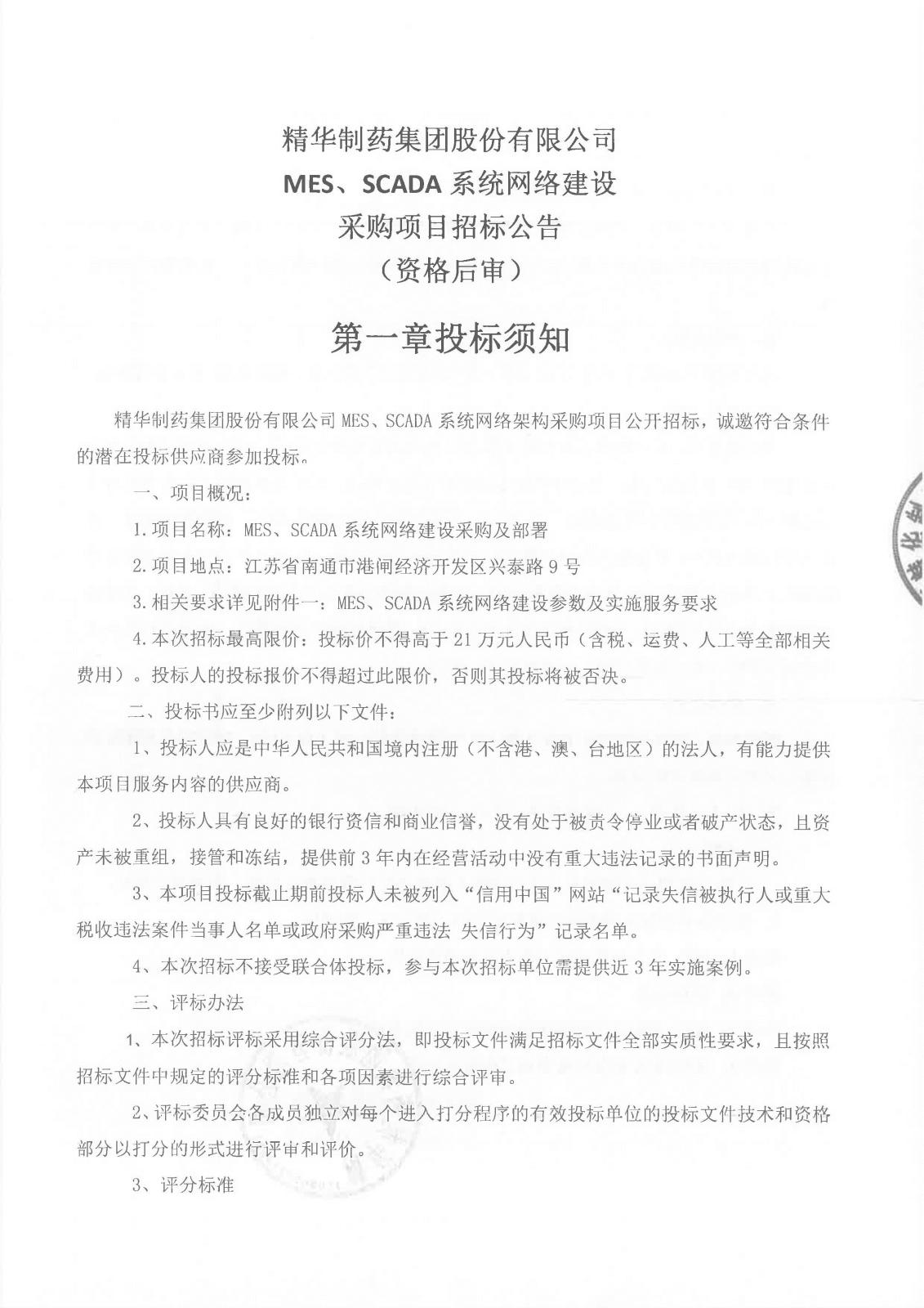 关于2026年精华制药MES、SCADA系统网络建设招标材料,详见附件:
